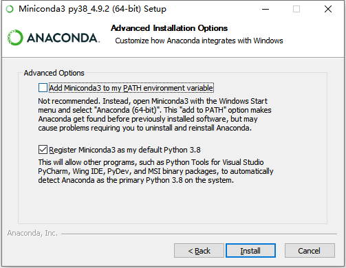从安装文件的大小也可以看出,Anaconda是Miniconda的8倍多。安装过程比较简单,需要记住的一点是,不要将可执行程序添加到环境变量,因为软件本身会安装一个版本的python, 添加环境变变量会覆盖系统已有的python,会出现之前已经安装的包使用不了的情况