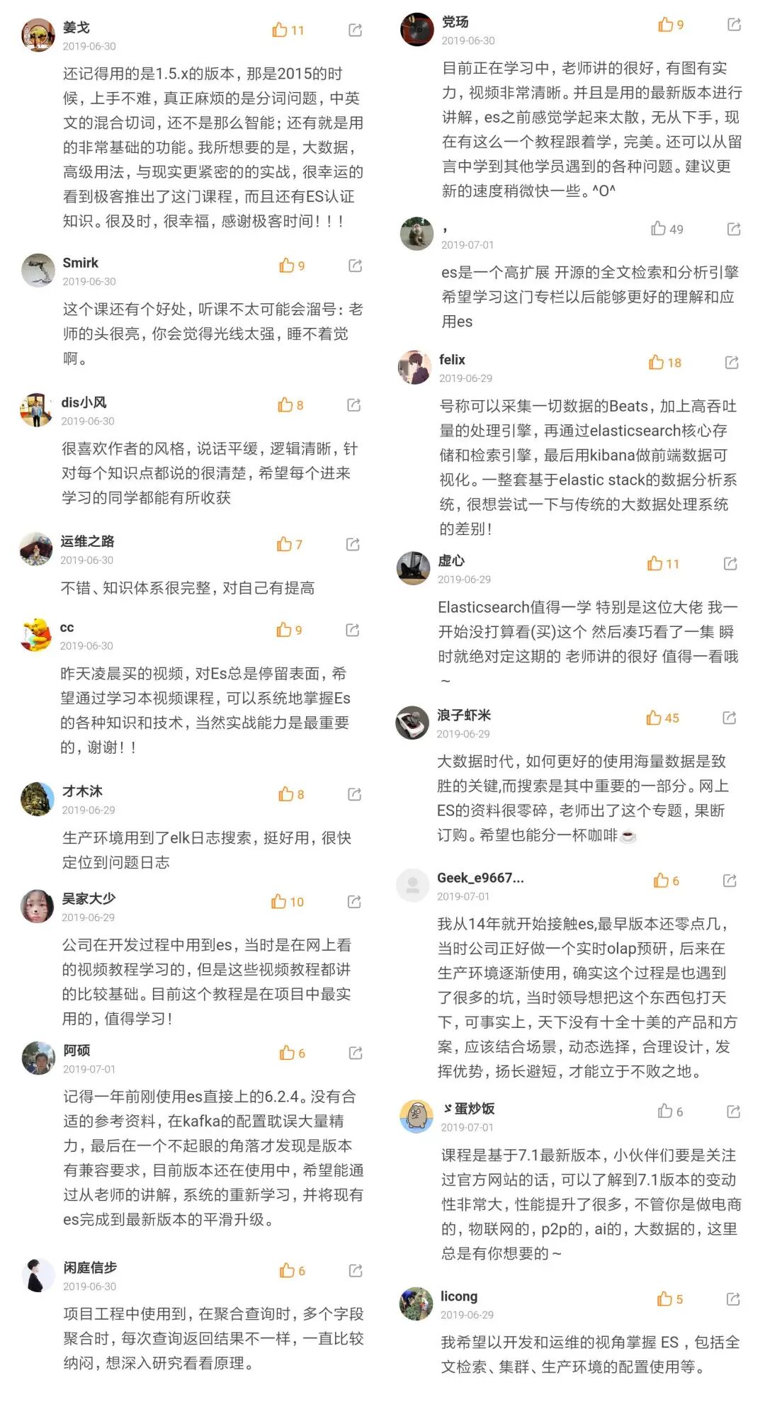 课程共 100 讲,基于 Elasticsearch 最新 7.x 版本,由浅入深地讲解了 ES 的基本概念与服务搭建,带你熟知其运行机制和常用技巧,并通过上手实战,掌握 ES 在实际项目中的应用。而且,课程覆盖了 Elastic 官方认证考试的全部考点,也算是学习技能之外的 bonus 了。