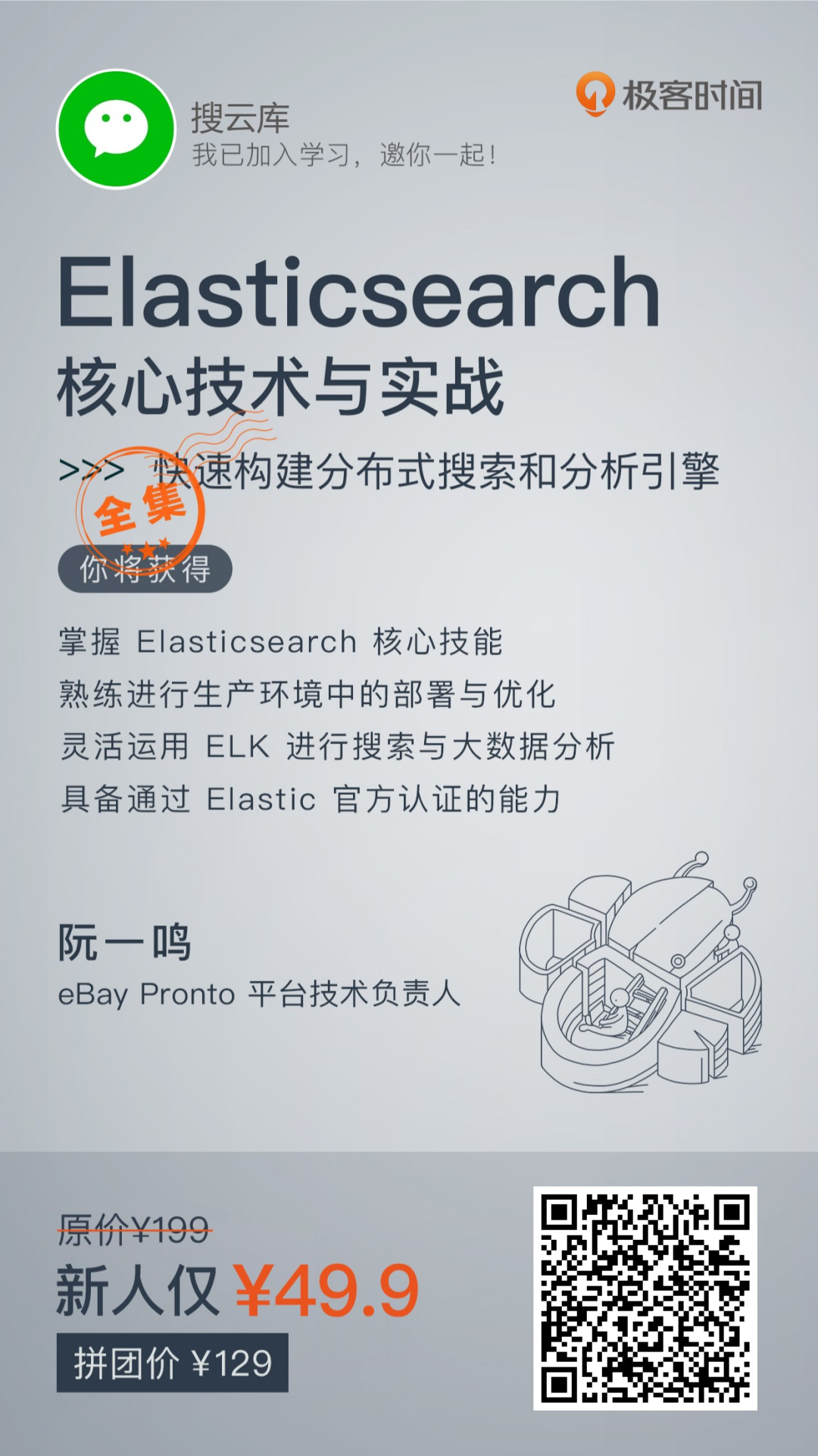 最早,听过他在 Elastic 中国开发者大会的分享,讲得非常不错。所以,那会儿得知他跟极客时间合作,推出了视频课《Elasticsearch 核心技术与实战》,我第一时间就订阅了。跟着学下来,感觉收获很大,帮我解决了工作中的不少问题。